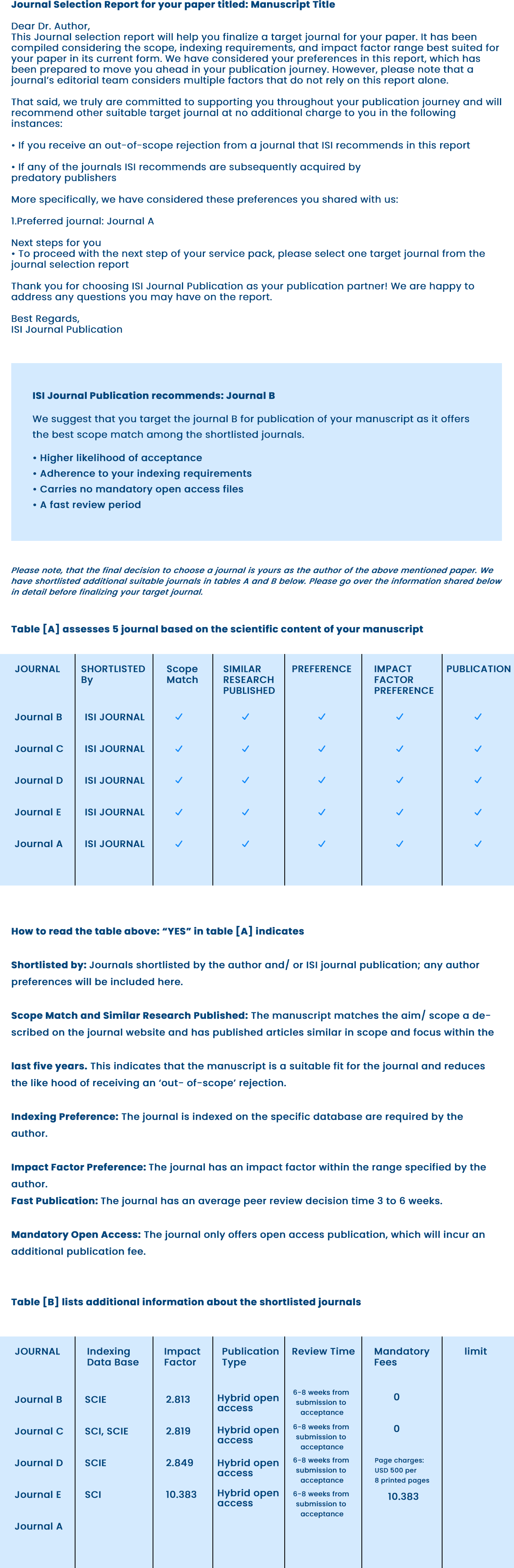 In our journal selection services, we provide a journal selection report to assist you in deciding on a publication for your paper. It is carefully constructed with your specific preferences in mind, taking into account the scope, impact factor range, and indexing needs best suited for your article in its current state.