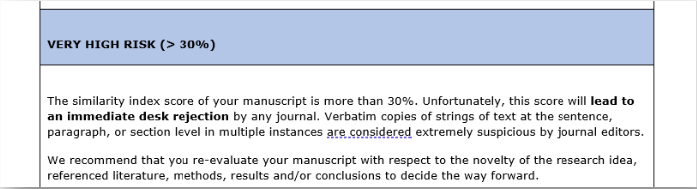 The plagiarism check report is accompanied by a brief guide that will help you interpret the Similarity Index score and take the required next steps to reduce the extent of text overlap between the identified sources and your manuscript.
