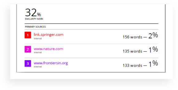 The overall Similarity Index is mentioned following the manuscript text. The report also highlights the identified matching sources from online databases and repositories, which are color-coded and ordered from the highest to the lowest percentage of matching words to the manuscript’s text.